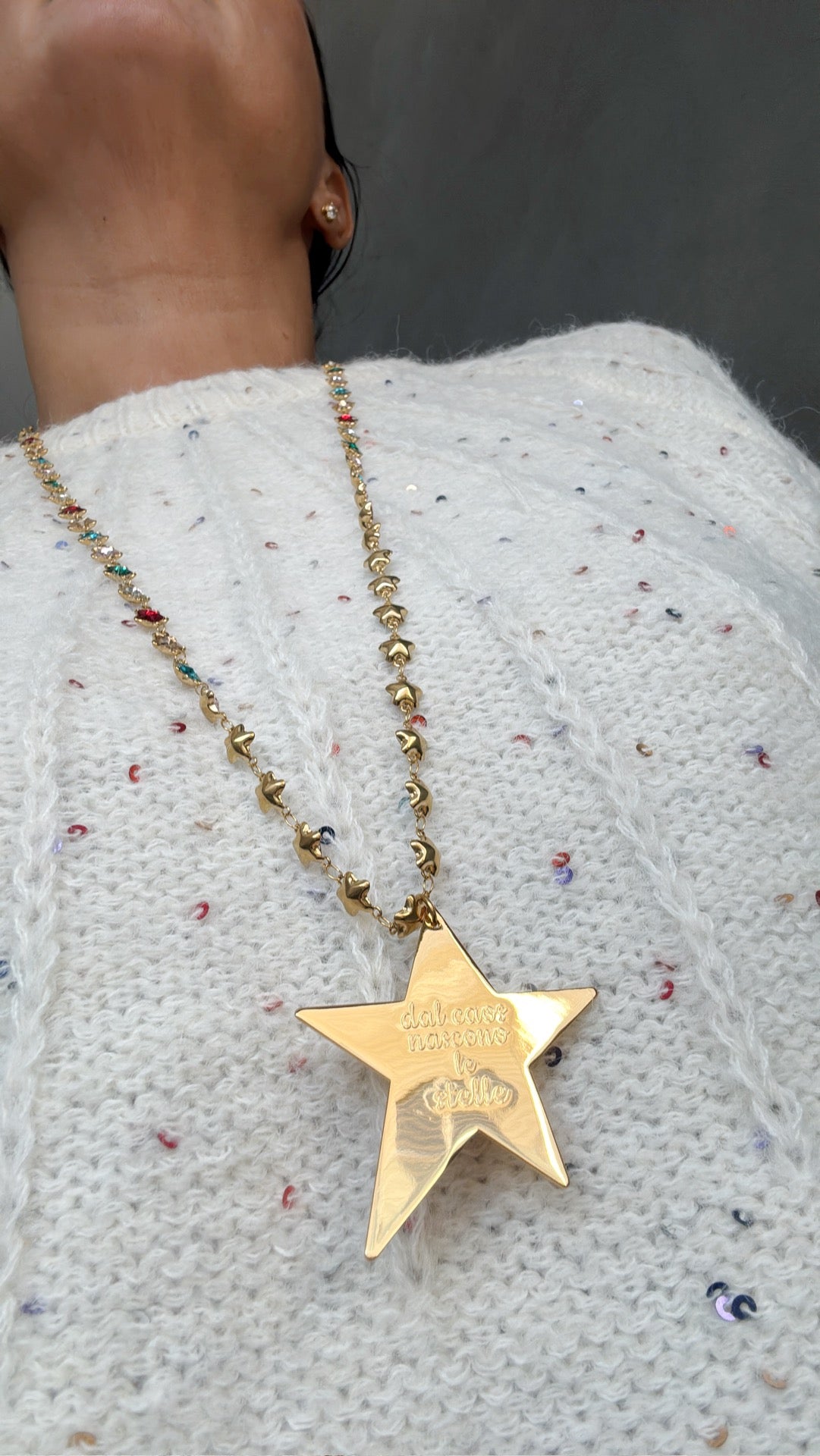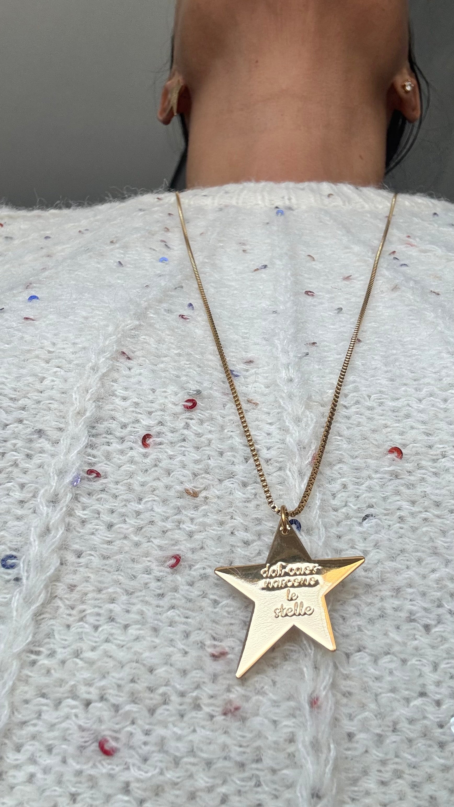puoi scrivere nell’apposita casella delle note se vuoi la versione con la catenina in acciaio oro e stelline in zirconi .