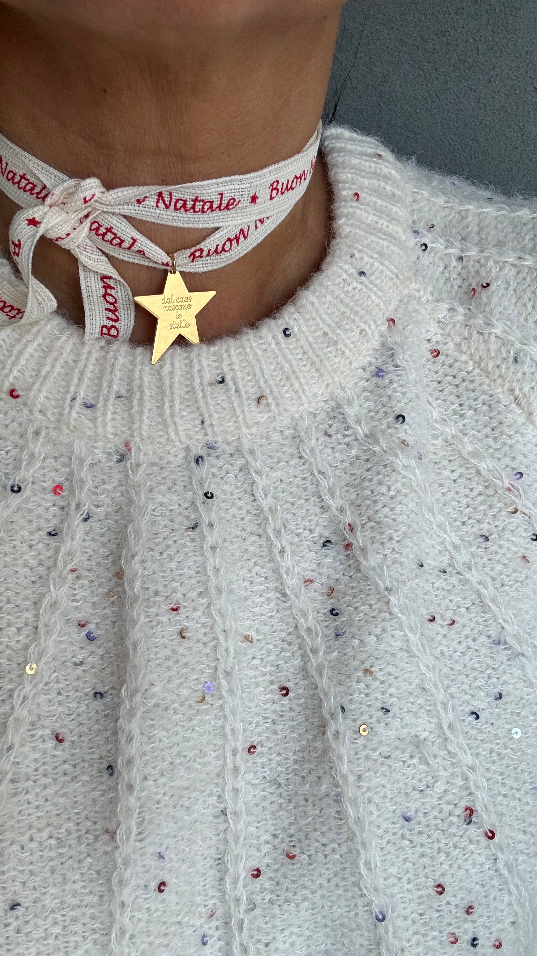nell’apposita casella delle note più inserire la descrizione del cordino che poi ti piace tra il cordino rosso cerato , nero cerato o un laccetto in cotone con scritta buon Natale